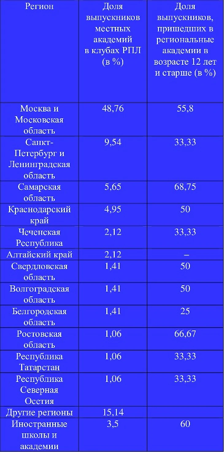 Проведенный анализ показал, что 86,89% российских игроков РПЛ являются выпускниками футбольных школ субъектов, находящихся в Европейской части России (58,3% – Москва, Московская область, Санкт-Петербург и Ленинградская область). На Азиатскую часть России приходится лишь 8,8 % выпускников футбольных школ, выступающих в сезоне 2020-2021 в клубах РПЛ. Безусловно, подобная статистика говорит об огромном дисбалансе в развитости футбола в различных регионах нашей страны. Москва и Санкт-Петербург значительно превосходят остальные регионы, практически, как и во всех других сферах жизни общества. Далее попробуем разобраться в причинах имеющегося дисбаланса, но для начала представим еще несколько любопытных статистических выкладок, которые также помогут дать ответ на вопрос о причинах столь значительного дисбаланса в развитии футбола между регионами.