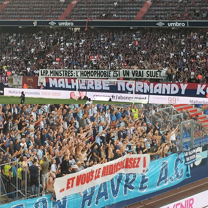 Однако ранее в эту же пятницу фанатская борьба с глупой политикой ПФЛ началась ещё в Лиге 2. Фанаты "Кана" и "Гавра" устроили совместную акцию, разместив на трибунах дополняющие друг друга баннеры: "ПФЛ, министры: гомофобия - это реальная проблема, а вы высмеиваете ее!"