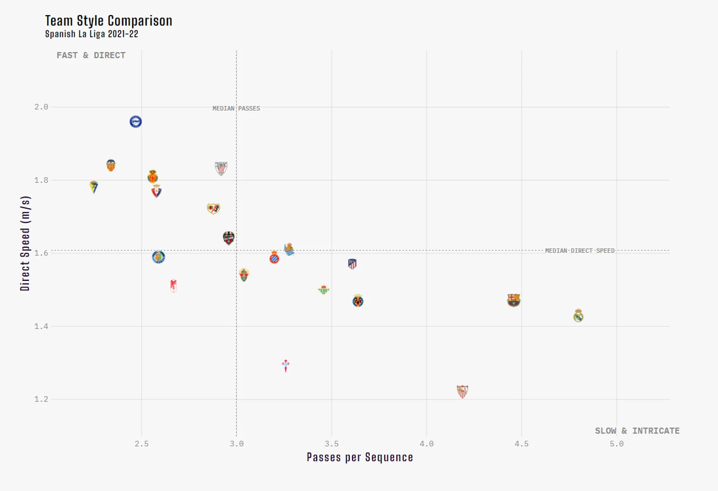 Начать хотелось бы с того, что атакующая игра басков наследует от обороны важную особенность – системность во всех действиях и минимизация ситуаций, в которых футболисты что-то изобретают. Но это ещё не говорит ничего о стиле игры команды. Атлетик искусно обороняется во всех блоках, и это является главной идентичностью клуба. Если ещё посмотреть на этот график: