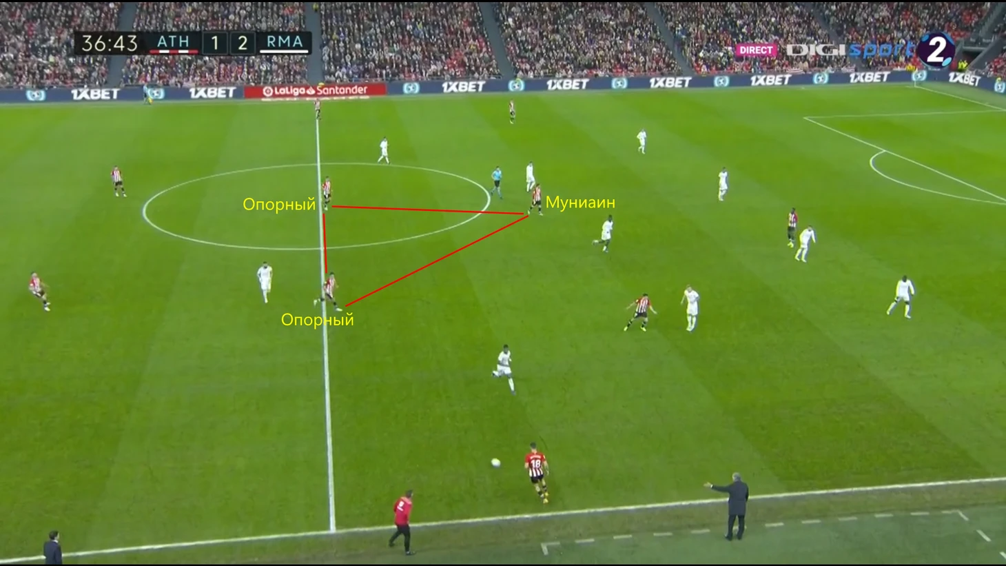 В большинстве случае, когда Муниаин подобным образом пытается открыться в оттяжке, он даже не получит мяч, т.к. чаще всего действия на левом фланге у Атлетика предназначены для того, чтобы освободить пространство на правом. «Слева "просаживаем" блок соперника, а затем через опорную зону стараемся вывести мяч на более свободный правый фланг» - логика, примерно, такая. В примере выше видно, что приблизительно так и происходит. Основным левым опорным у басков является Дани Гарсия: он, конечно, выдерживает определённый уровень в работе с мячом, но всё-таки задачи по эффективному продвижению на него не возлагаются, как и на весь левый фланг. Хотя, при достаточном пространстве, комбинации могут проходить и слева, иначе противнику было бы слишком просто предугадывать действия басков. Ещё упомяну о том, что Иньиго Мартинез (центральный защитник) часто отдаёт именно диагональные лонгболлы, пытаясь доставить мяч на пространство правому вингеру или центральному нападающему, чтобы тот сбросил мяч в свободную зону: