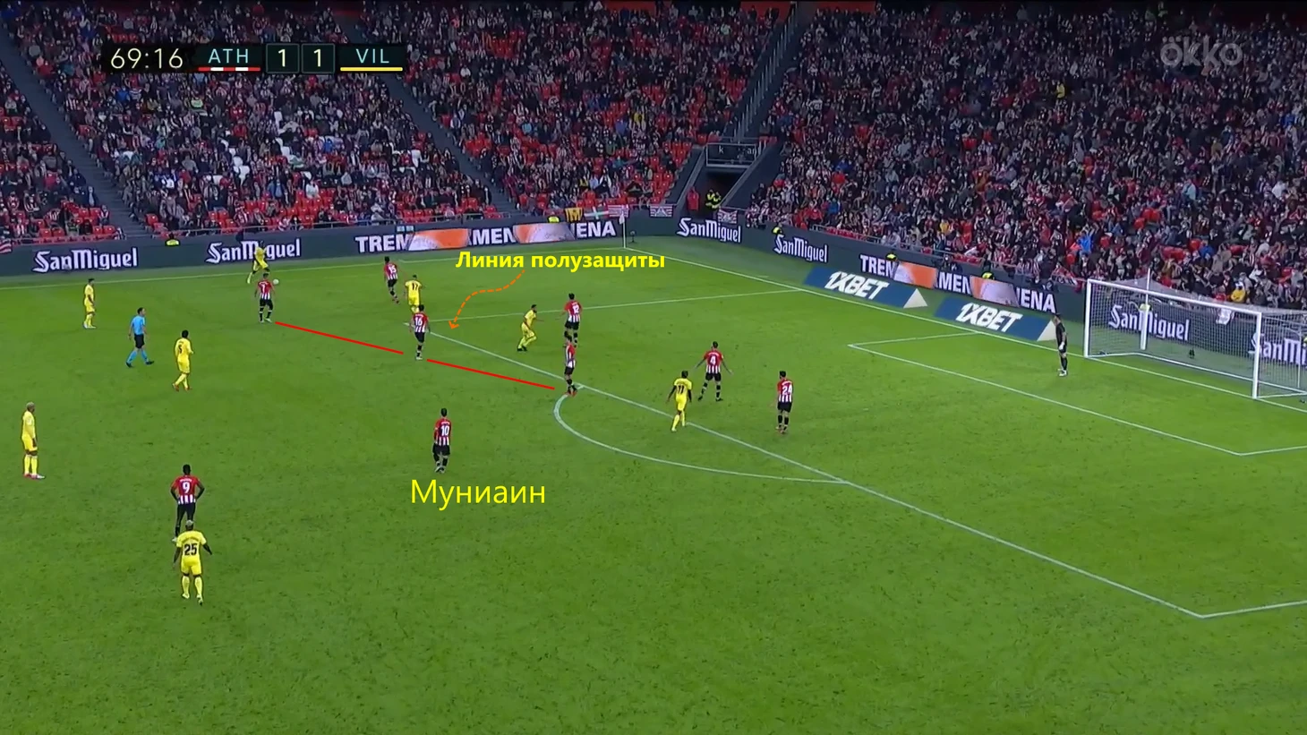 Изначально Уильямс находится под опекой Васкеса в широкой позиции, а Муниаина опекает Вальверде ближе к центру, далее Уильямс убегает на своё привычное место, а на фланг уходит Муниаин, при этом Васкес, перед тем, как передать Уильямса центрбэку, сделал несколько шагов за ним, что не позволило быстро встретить Муниаина. Так Икер получил лишние метры для свободного продвижения мяча до финальной трети поля. Тут капитан басков сыграл роль вингера, но надо понимать, что он – по функционалу игрок без амплуа, то есть некий свободный художник, но внутри системы, конечно.