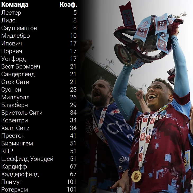 В эту пятницу, 4 августа, стартует славящийся своей непредсказуемостью второй английский дивизион под названием Чемпионшип. Но это не останавливает нас из EFL Zone от того, чтобы поиграть в «легендарные прогнозы». Но для начала посмотрим, что думают букмекеры. На картинке ниже коэффициенты на чемпионство: