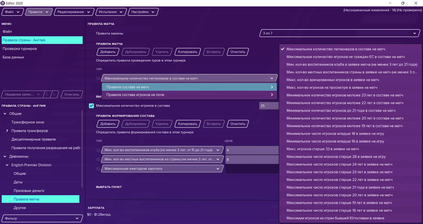 ежегодная зарплата; легионеры и игроки не из ЕС; воспитанники (что мы уже выбрали); различные ограничения по возрасту и наличие иностранных голкиперов и арендованных игроков в команде.
