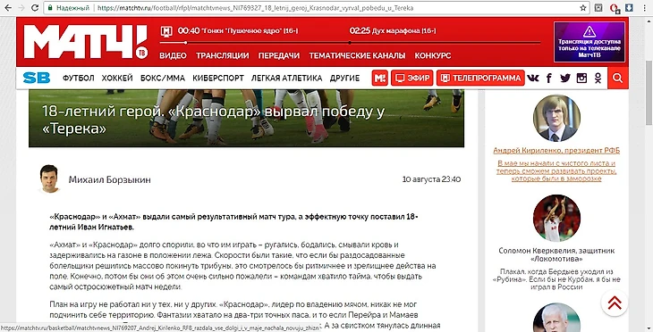 «Ахмат» в матче 5-го тура РФПЛ уступил на своем поле «Краснодару» (2:3). МатчТВ оперативно опубликовали на своём сайте текстовый обзор матча,в котором уделили особое внимание 18-летнему Ивану Игнатьеву,который забил победный гол в ворота «Ахмата».