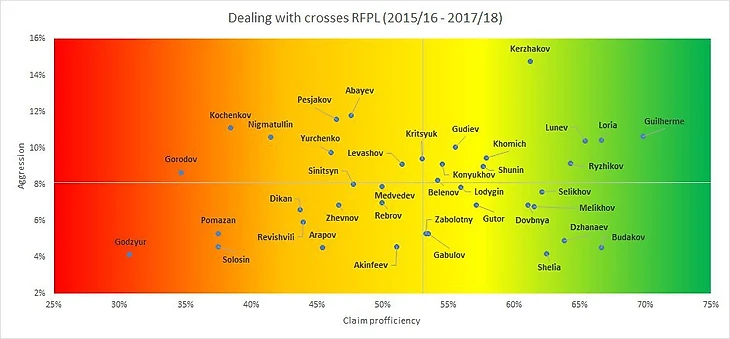 Аналитический паблик «Блокнот» любезно поделился со Sports.ru графиком, где показано, насколько часто и успешно вратари чемпионата России срываются на выходы. Безоговорочный лидер тут Гильерме, а Селихов где-то совсем рядом.