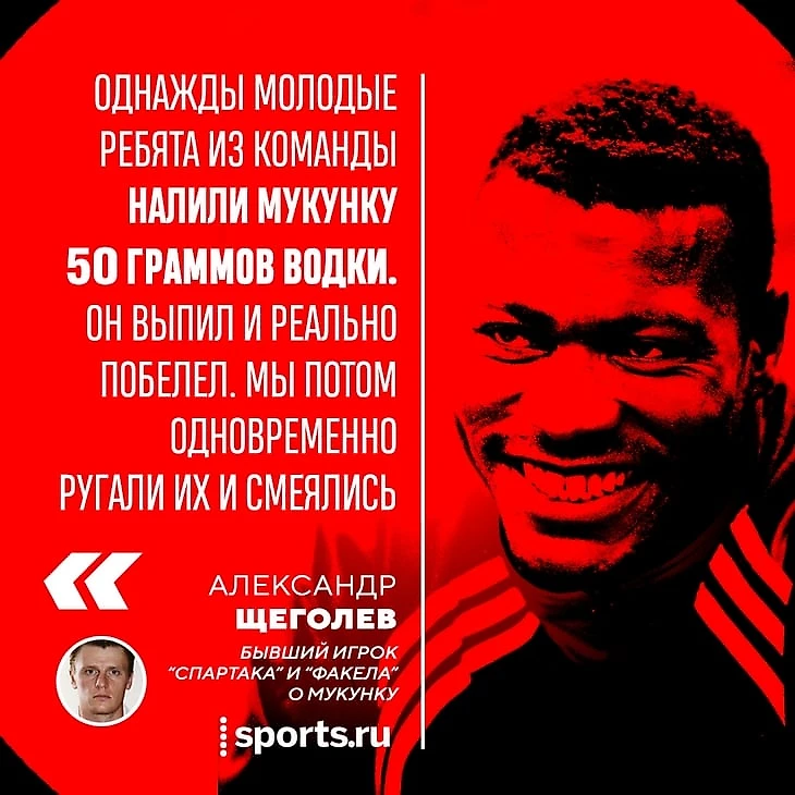 «Мы его называли Жора, – говорит Щеголев Sports.ru. – Когда ему хотелось, он все по-русски понимал. В «Факеле» тогда были задержки по зарплате, Мукунку приходил ко мне: «Александр, ноу мани – ноу плэй». Я ему объяснял, что его тут никто не обманет, в Воронеже ответственные люди, все выплатят. Еще Мукунку участвовал во всех мероприятиях и на поле, и вне поля, хотя жена у него была очень жесткая. Помню, как-то после победы пошли выпить пива всей командой, а он чуть подзавис с нами. Потом жена приехала в клуб к руководству и спрашивала, что мы творим вообще. Я его потом спрашиваю: «Жора, что это такое, почему жена в клуб приходит?». У нас же это называется «подкаблучник», а он говорит: «Ну, вот так у меня в семье». Она просто переживала, что с ним может что-то случиться. Хотя однажды был случай: молодые ребята из команды налили Мукунку 50 граммов водки. Он выпил и реально побелел. Мы потом одновременно ругали их и смеялись».