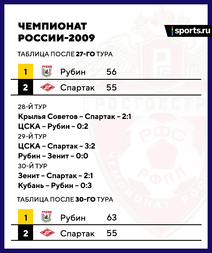 Совершенно здоровая борьба за первое место, где «Спартак» действительно в итоге полностью провалился, не набрал ни одного очка и отстал от «Рубина» на восемь.