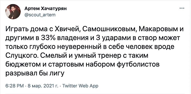 Да, Слуцкий всех этих игроков поставил в основу, за что заслуживает респекта. И я не говорю, что он слабый тренер. Я говорю, что Слуцкий неуверенный в себе человек. У него есть ограниченные, но понятные идеи. Он хорошо их доносит до футболистов, на уровне РПЛ они работают. Поэтому десять лет человек играет в одно и то же.