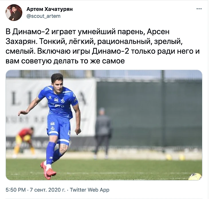 Если пробовать все же объяснить мою такую реакцию на Захаряна, то я написал, что он рациональный, смелый и расставляет действия на поле в идеальном порядке. Он делает то, что требует игровая ситуация, а не тренер. Исходя из своих представлений об игре. И рвет шаблоны – что необязательно молодому игроку сначала ошибаться, чтобы стать зрелым. Он уже зрелый – теряет минимум мячей и приносит огромную пользу в атаке.