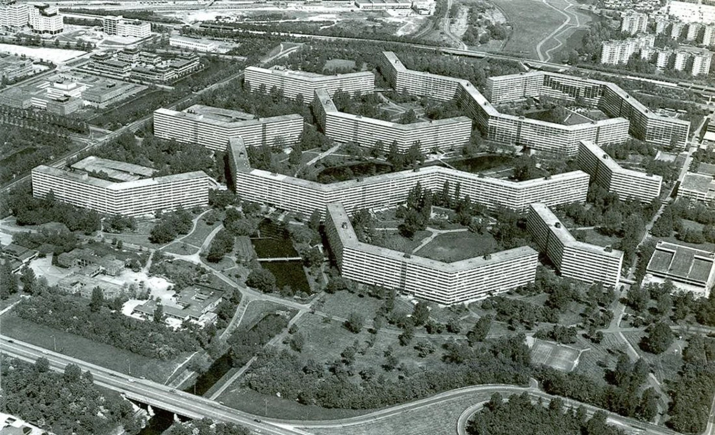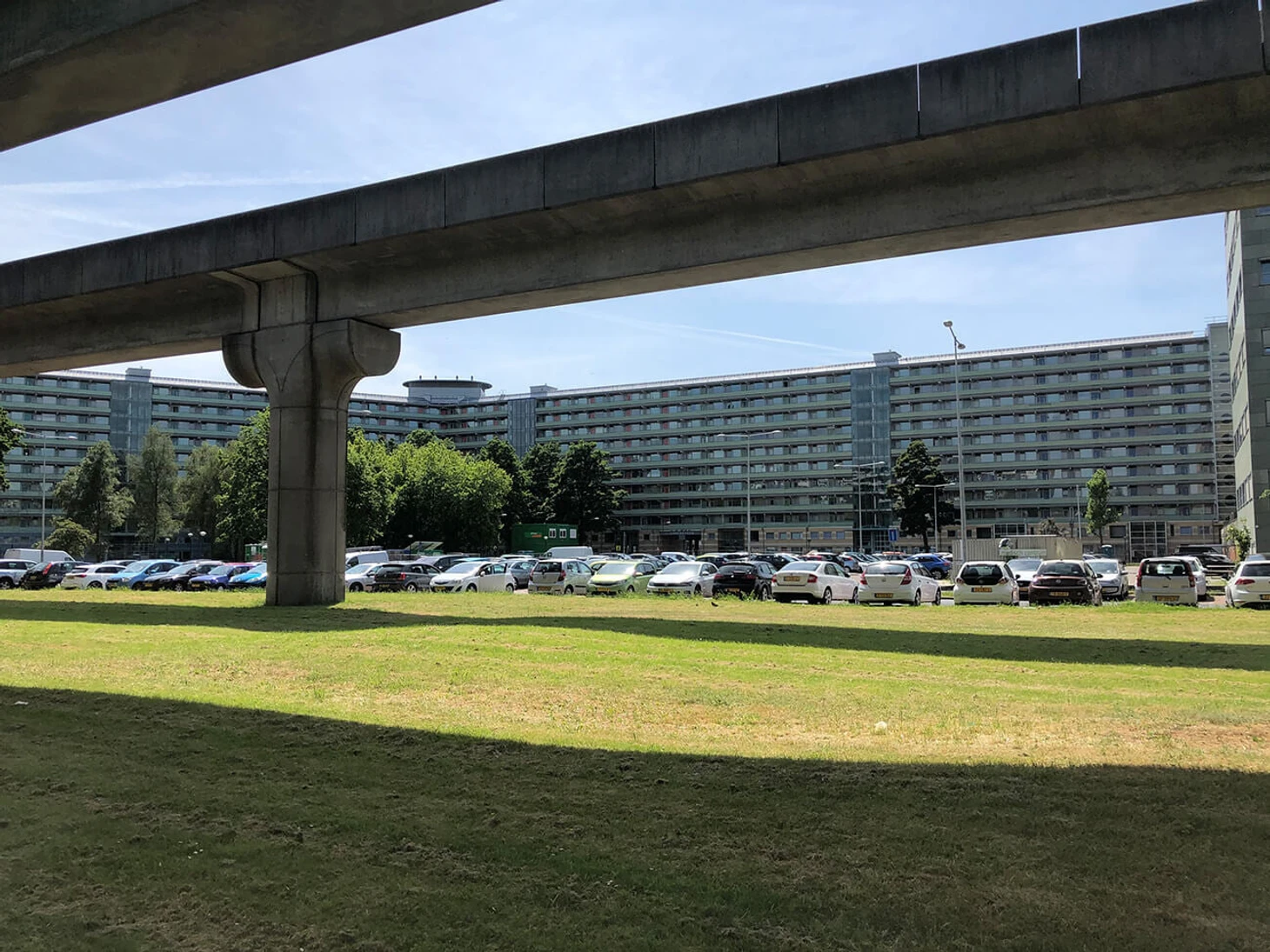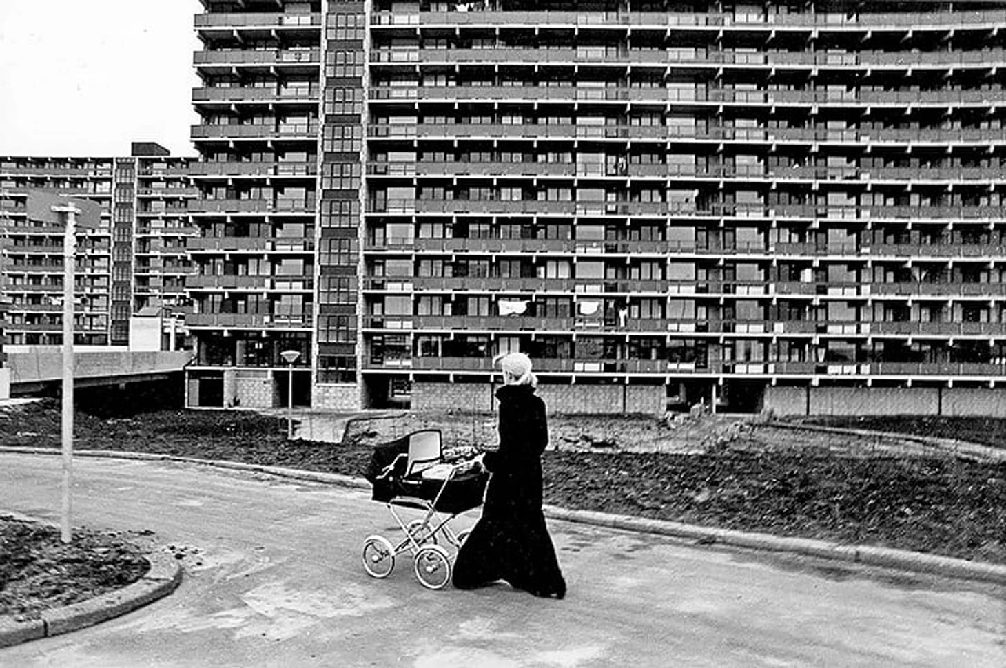 Новый район Бейлмер должен был решить все проблемы: построили огромный жилой комплекс на 110 тысяч человек, а вокруг все устроили по-новому. Никаких дорог (их видели вторым уровнем на эстакадах), только пешеходные дорожки, квартиры в корпусах соединяли длинные коридоры – предполагалось, что это объединит соседей. В виде таких пчелиных сот и строили жилье.