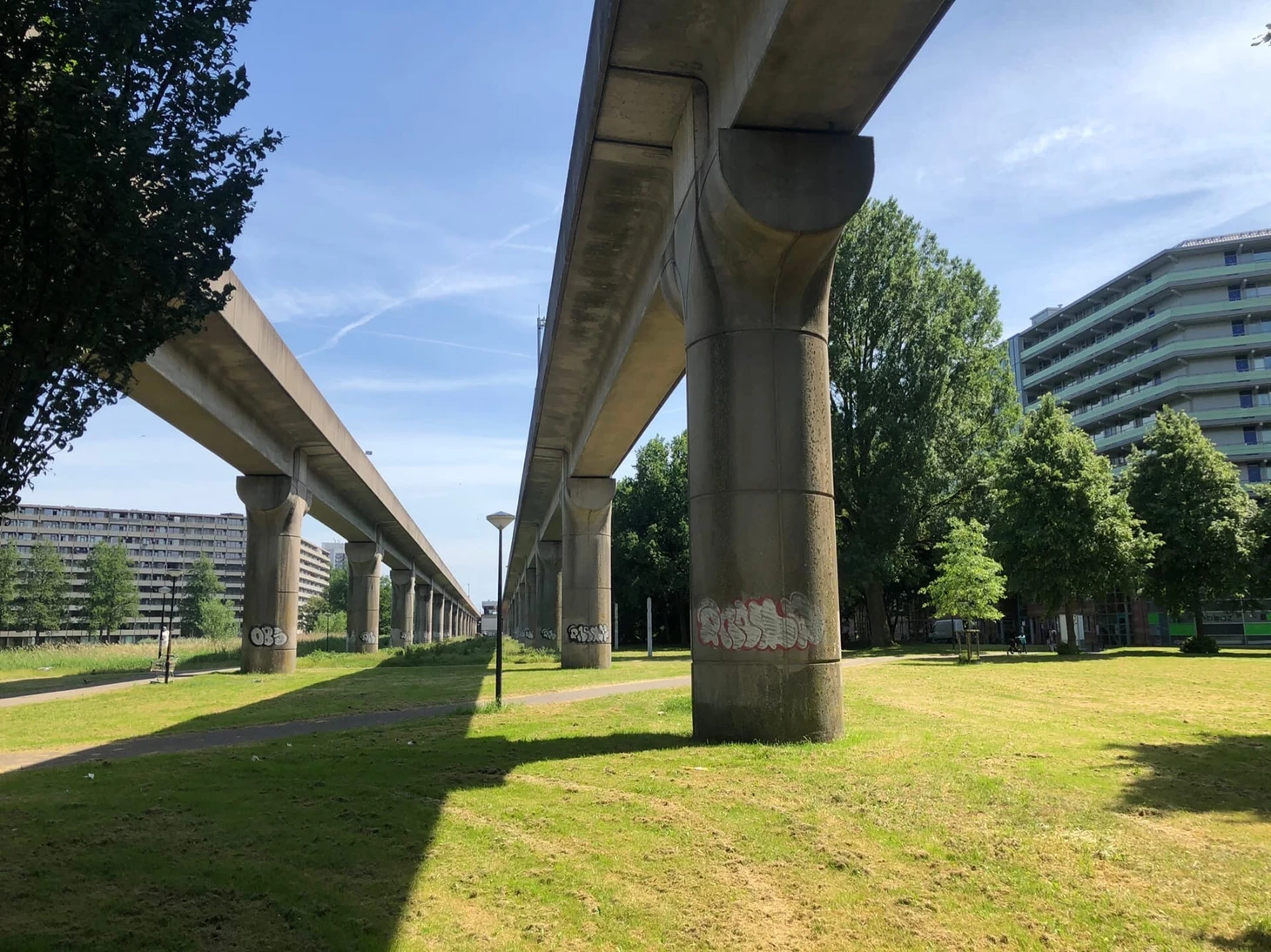 12. Идем дальше – впереди еще меньше жизни, зато больше камней, воды и зелени. Здесь, кстати, Тил устраивал фотосессию. А по этим бетонным эстакадам ходит метро – одна станция и район заканчивается. Пройдем ее пешком!