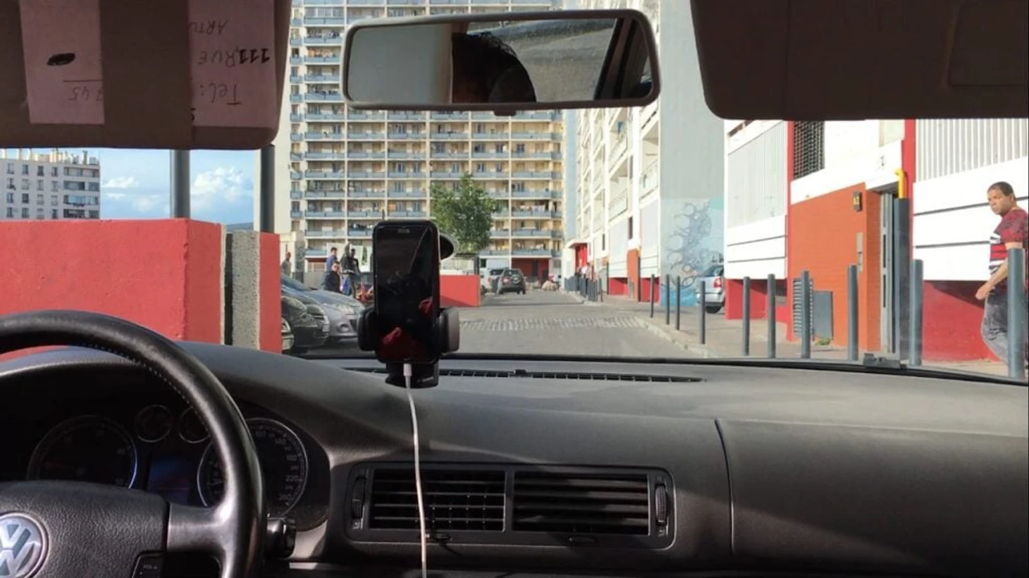 Тогда он повез нас на старом «Пассате» в места, где начинал жить в Марселе, куда-то в кварталы с многочисленным социальным жильем. И случайно заехал в тупик: не знал, что проезд заложили камнями. Когда понял, быстро развернулся, но сзади нас уже ждали четыре крупных парня (на фото ниже они слева от телефона). Двое держали деревяшки, а к машине подошел мальчик лет 12, постучал мизинцем по капоту и дал понять: «Тормозите».