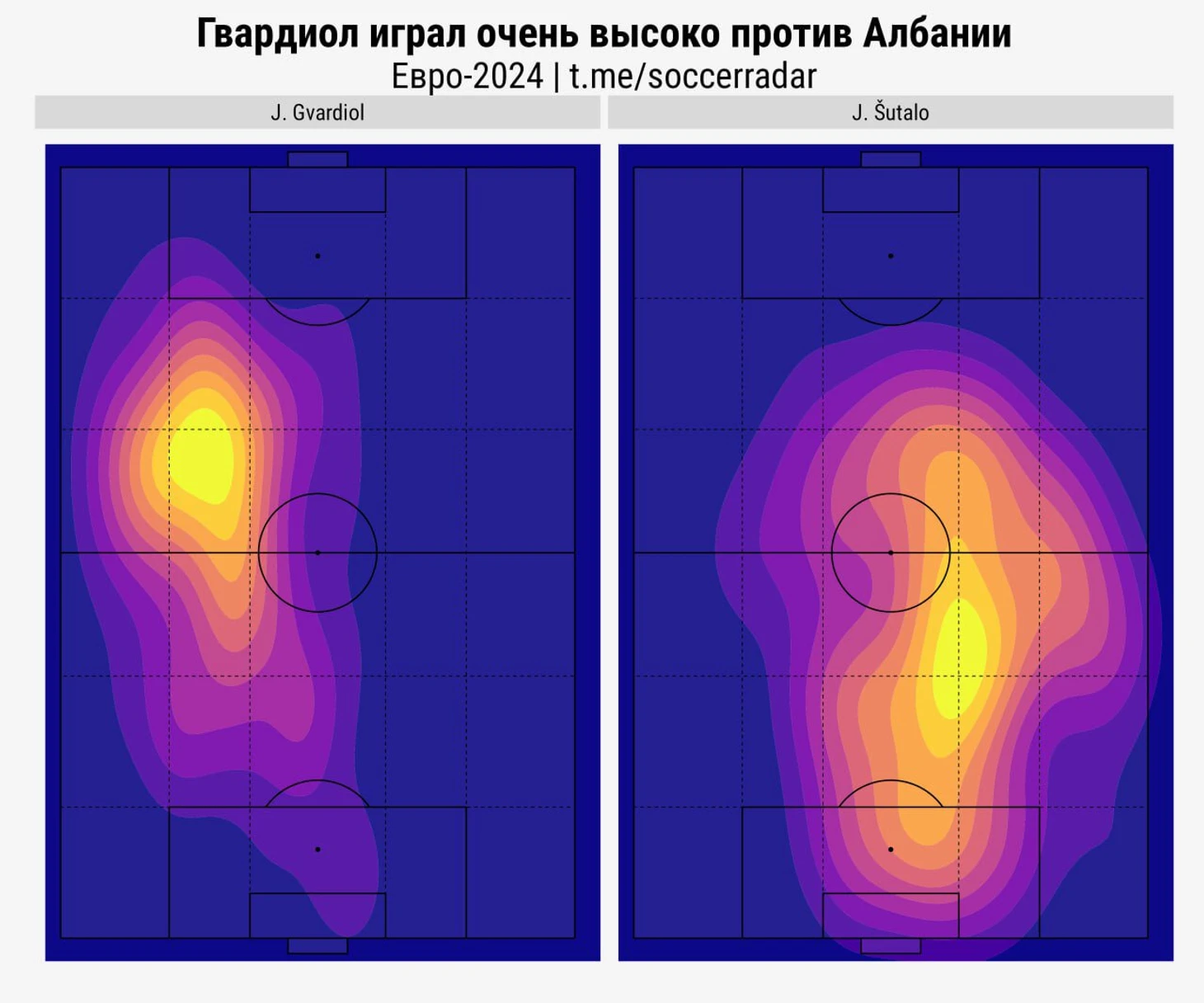 Средняя высота действий Гвардиола – 55 метров, Шутало – 41. Кажется, Йошко уже не может без атаки. Или атака не может без него.