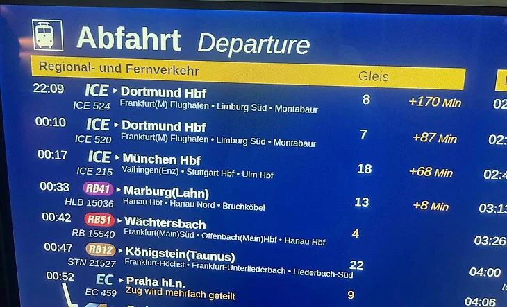 Только вдумайтесь: я приехал на вокзал Франкфурта в 00:18, но с огромным запасом успевал на поезд, который должен был отъехать еще в 22:09.