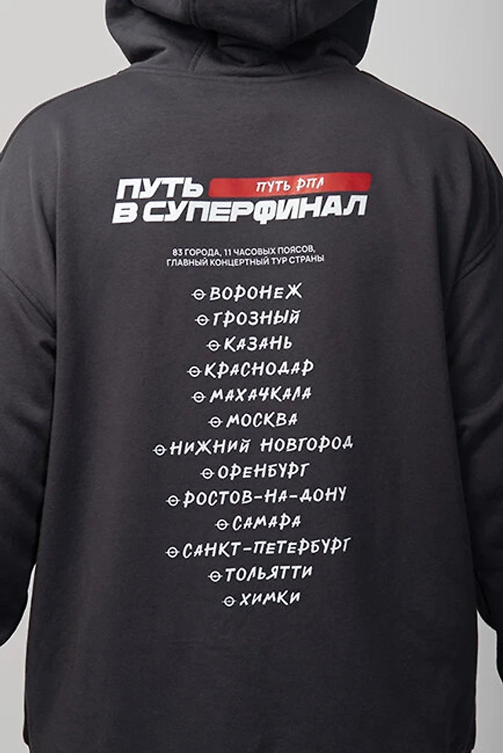 На спине худи из этой коллекции расположены города-участники Кубка – похоже на афишу концертного тура.