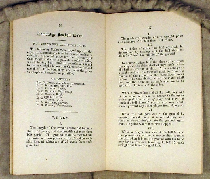 Организованный футбол появился в Англии в начале 19 века. В командах было одинаковое количество игроков (от 11 до 14 и более игроков в одной команде), играли на поле длиной 70-90 метров, появились ворота. Играли в футбол команды колледжей, но правила у каждого колледжа были свои: одни разрешали играть руками, другие запрещали. Первый свод правил футбола разработали в 1846 году в Школе Рагби, спустя два года уточнения добавил Кембридж. По этим правилам играет уже обязаны играть ногами. Позже «Кембрджские правила» с небольшими изменениями приняли за основу правил Футбольной ассоциации Англии (ФА).