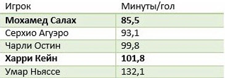 Еще один показатель - количество минут, затраченных на один гол. Ситация такова: