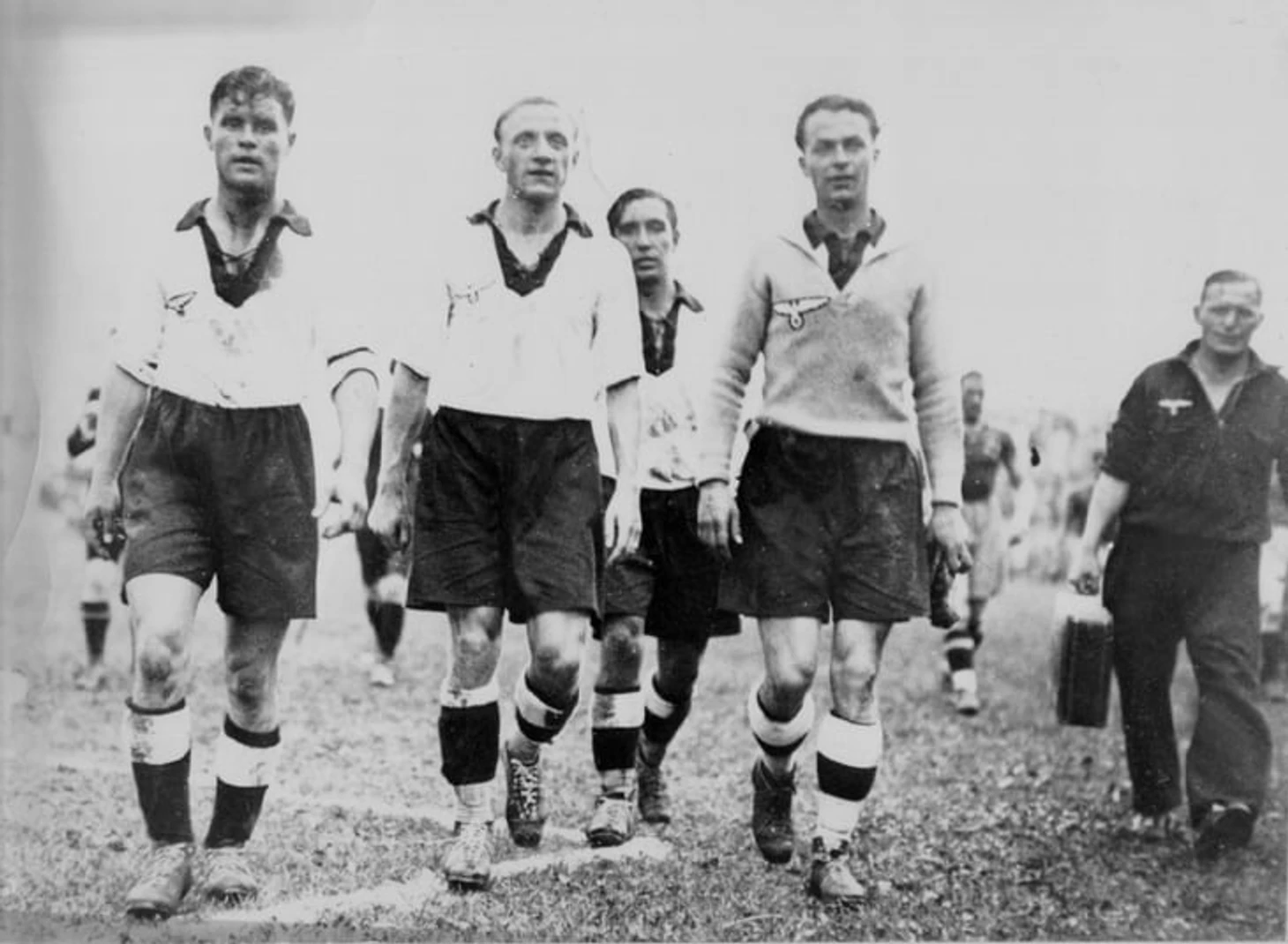 К концу 30-х нацистская пропаганда в Германии и на оккупированных территориях стала тотальной. Футбол не был исключением, так что на футболках двух игроков «Шальке» во время финального матча красовался рейхсадлер – орел, держащий в лапах свастику, символ и герб нацистской партии.