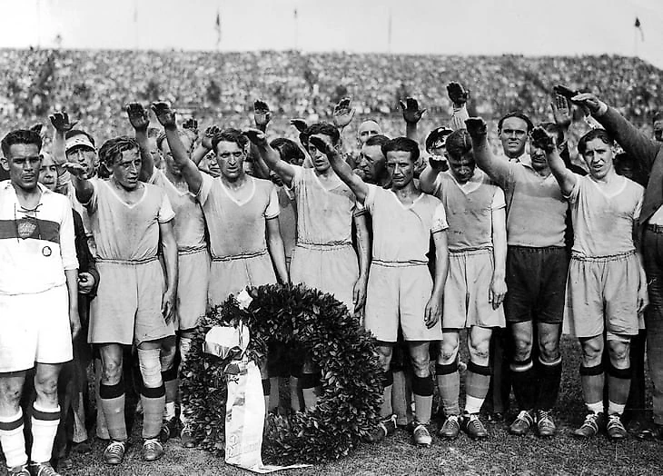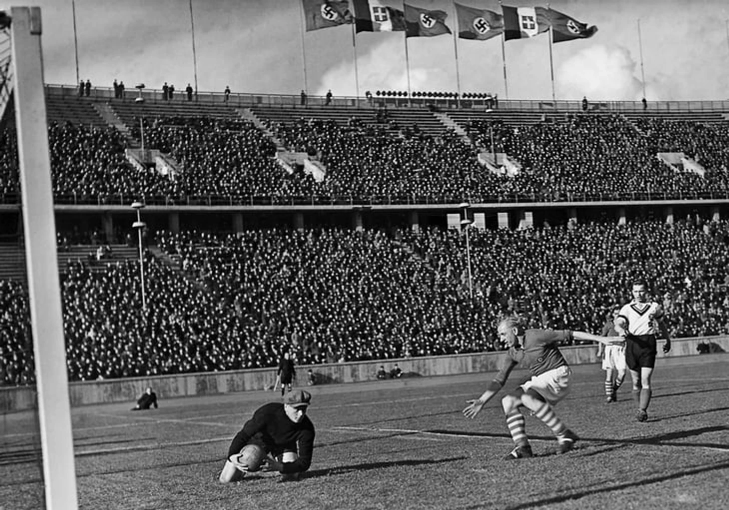На самом деле Адольф Гитлер, в отличие от Муссолини, никогда не любил футбол. Единственный матч, который посетил фюрер, – Германия – Норвегия на Олимпиаде 1936, немцы проиграли 0:2. Несмотря на прохладное отношение Гитлера, футбол оставался самым популярным видом спорта в стране, поэтому нацистский режим и старался использовать его в своей пропаганде, называя футболистов арийскими образцами для подражания, которые сражаются за свою родину.