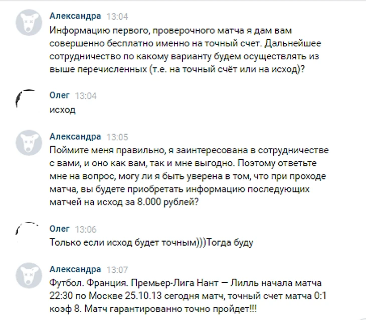 Также поделюсь личным опытом столкновения с мошенниками, имеющими партнерские отношения с БК. 7 лет назад ко мне в друзья в vk “постучалась” симпатичная девушка с закрытым аккаунтом, добавив ее, я вступил в переписку, уточнив знакомы ли мы. На мой вопрос получил типичную “простыню” из коммерческого предложения по ставкам на спорт как это делают чат-боты на специализированных сайтах. Далее мне был предоставлен точный исход первого якобы бесплатного “договорняка” и его статус меня немного удивил. Если этот “прогноз” окажется верным, то на выигранные деньги я должен был покупать результаты других матчей. Это была встреча французской Лиги 1 между “Нантом” и “Лиллем” сезона 2013-2014. На тот момент команды шли на 3 и 4 местах в национальном первенстве, а третья строчка давала право играть в Лиге Чемпионов на следующий сезон.