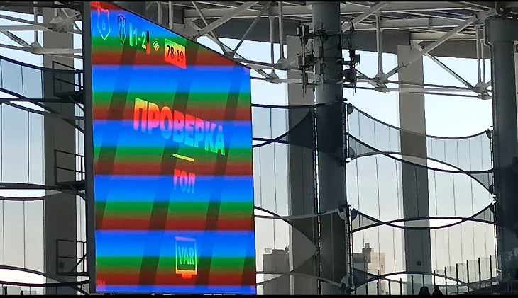 Разбег. Удар. Гол. 1-2. Хотя через камеру смартфона было видно как мяч полетел в сетку ворот с небольшим сопротивлением. Мне показалось, что голландец пробил с нарушением правил. "Оказалось, что не показалось" и видео-ассистент рефери предложил главному арбитру проверить этот эпизод с ударом на VAR-мониторе.