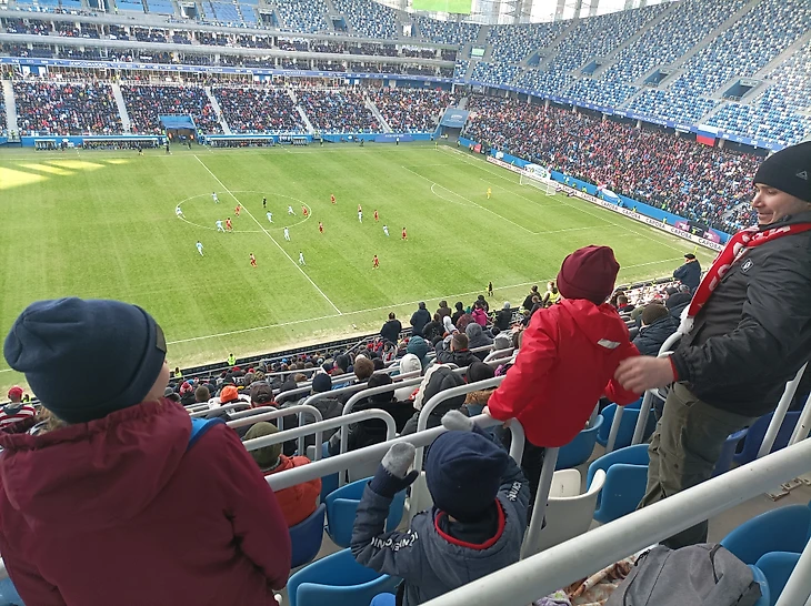 Одним рядом ниже нас расположилась молодая семья с 2 детьми, где папа и старший сын поддерживали "Спартак", а мама и младший сын переживали за ФК НН.