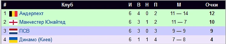 В том же сезоне такой же трюк исполнил “Андерлехт”, только аномальный триумф бельгийцев произошел в одиночку в отличии от героев абзаца выше. Это стало возможно благодаря двум победам над ПСВ 1-0 и 3-2, а также обменами домашними викториями с “Манчестер Юнайтед” и “Динамо” Киев. Только на выезде брюссельцы проигрывали крупно: 1-5 на “Олд Траффорд” и 0-4 в “Олимпийском”, отвечая выигрышами с более скромным счетом.