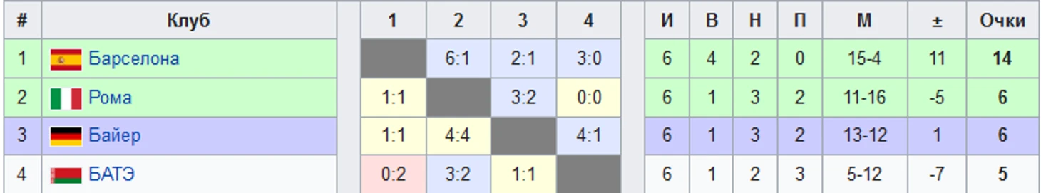 Спустя 2 года похожий путь прошла “Рома”. В этот раз в виде безоговорочного доминатора группы выступала “Барселона”, а римляне, “Байер” и “БАТЭ” решали кто из них станет вторым. В более выгодную позицию себя поставили итальянцы и немцы, забрав по очку в домашних матчах с каталонцами (кстати это была та самая игра “Байер” - “Барселона”, где Василий Уткин уснул во время репортажа). А в личных разборках “волки” сыграли фееричные 4-4 в Леверкузене, а на “Олимпико” дожали “аспириновых” 3-2. В итоге все те же 6 очков с разницей мячей в минус 5 и да здравствует плей-офф с повторением антирекорда “Зенита”.
