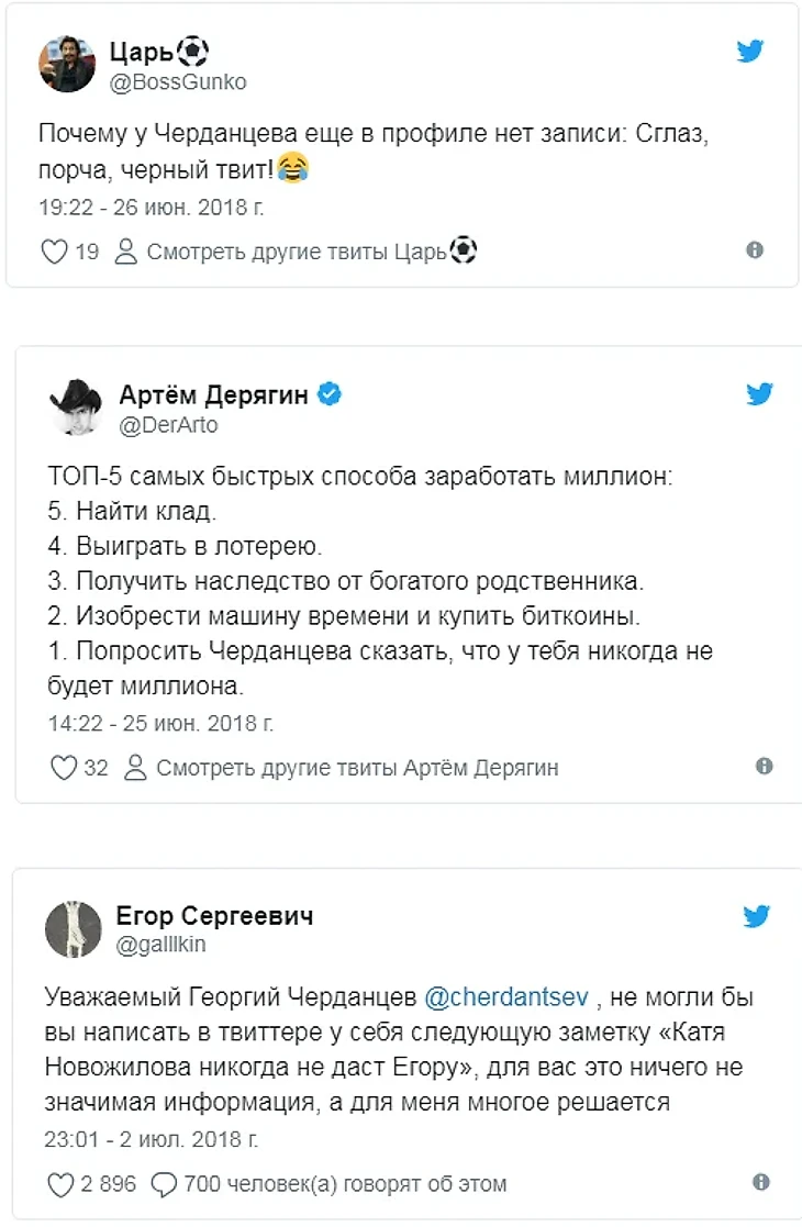 Летом 2018 года на мундиале в России Черданцев “хоронит” Уругвай в группе, но команда Оскара Табареса выигрывает все матчи в своем квартете и уверенно двигается дальше по турнирной сетке. Журналист также напророчил поражение России от Испании и победу Аргентины над Францией - все произошло наоборот. Во время игры Япония-Бельгия после того, как японцы повели с разницей в два мяча, Черданцев предсказал победу Японии - в результате Бельгия отыграла три мяча и победила. Реакция в твиттере последовала незамедлительно: