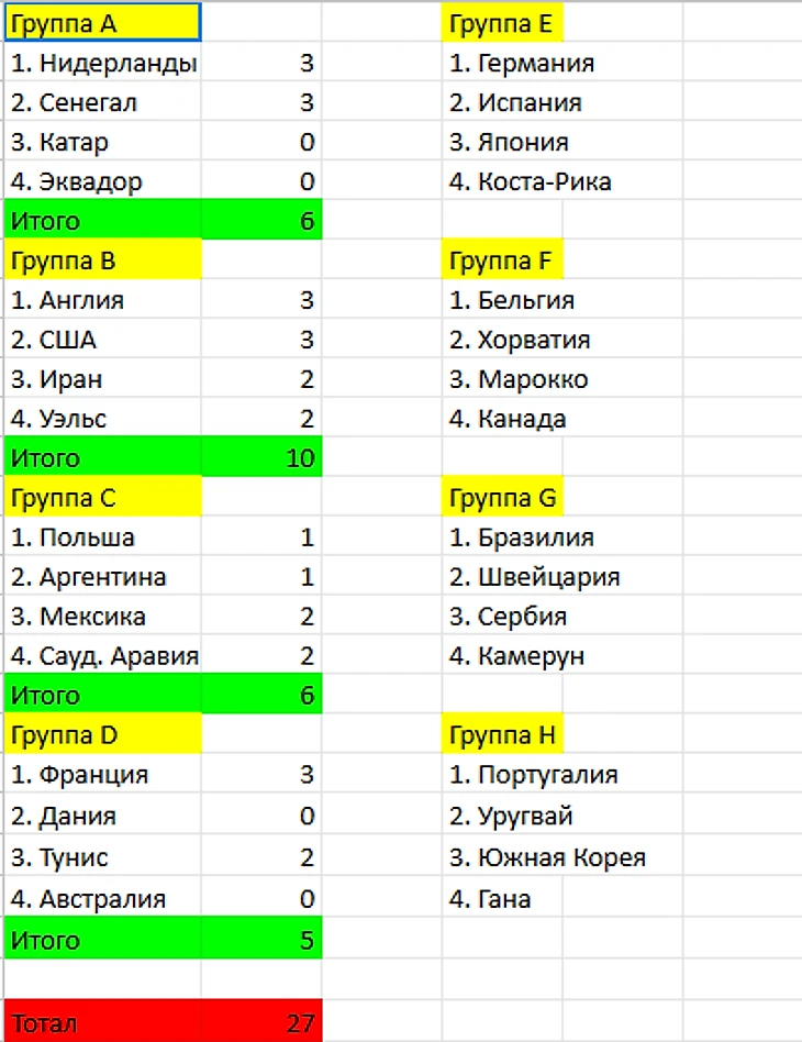 1.Необходимо зафиксировать на бумаге или в электронном документе исходы всех 8 групп на ЧМ (именно позиции сборных, а не конкретные результаты встреч). Ниже пример моего прогноза для наглядности.