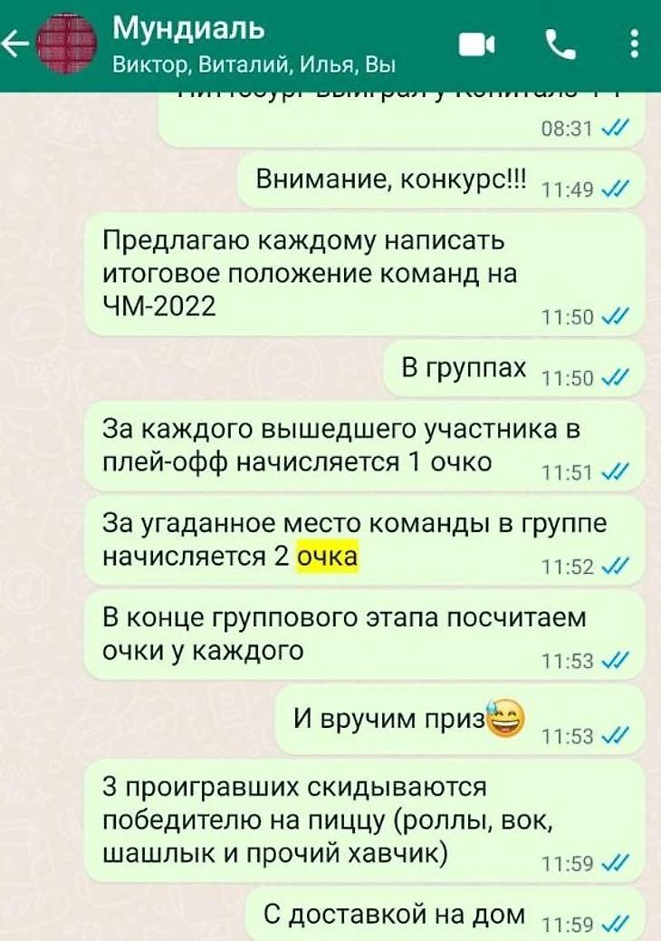 В конечном итоге договорились, что двое проигравших оплачивают победителю заказ еды на указанный им адрес в размере 1000 рублей (по 500 рублей с каждого проигравшего).