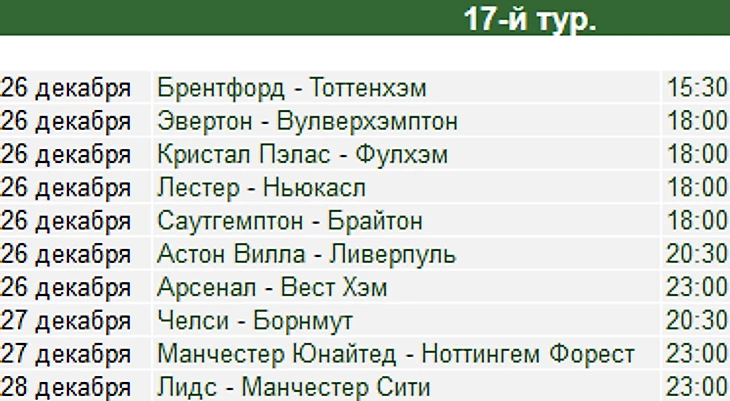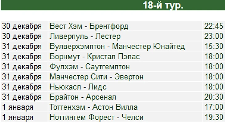Ну а 18-й тур подарит нам много матчей, в частности “Манчестер Сити”-“Эвертон” и “Брайтон”-“Арсенал” под праздничный салат оливье.