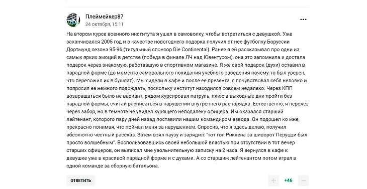 В конце октября Спортс запустил конкурс, в котором разыгрывал свой мерч. Условия для выигрыша - написать в комментарии к посту свою историю, связанную с игровой формой. В список счастливчиков попадут три самые заплюсованные среди пользователей и дополнительно две выберет редакция сайта (в итоге получилось даже три).