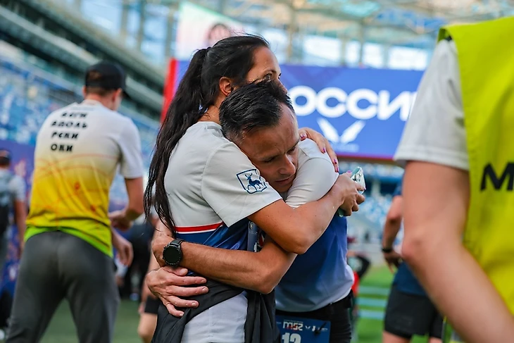 Честно, смутно помню какие-то подробности, ощущений в первые секунды. Наташа и Юля ждут на Финише. Падаю на Наташу совсем без сил. Наташ стойко меня держала и терпела…Спасибо! После объятий Наташи, настроение поднялось, с Юлей уже улыбаюсь, радуемся, что мы смогли. Что-то говорим другу – другу, уже не помню.