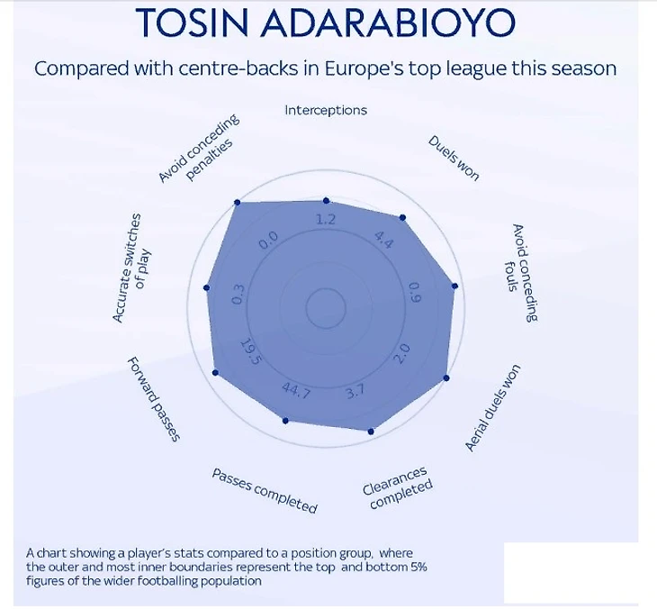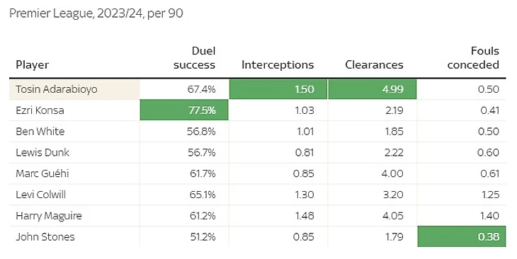 Возможно, стоит обратить внимание на этого игрока, учитывая его текущие достижения. Он опережает всех упомянутых игроков по ряду ключевых статистических показателей в Премьер-лиге, даже превосходя «Ман Сити Стоунз» в некоторых аспектах. Он выиграл больше оборонительных поединков (67,37%), совершил больше перехватов за 90 минут (1,5) и сделал больше передач за 90 минут (4,99), чем все остальные. Кроме того, у него больше передач головой за 90 минут (3,33), чем у любого другого центрального защитника в Премьер-лиге, проведшего более четырех матчей.