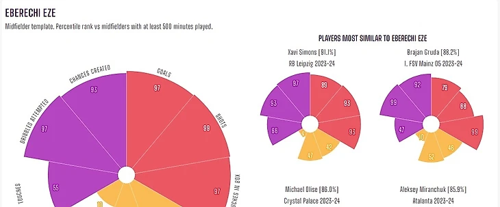 Впечатляющие навыки Эзе в дриблинге действительно выделяются. Его голевая передача Матете в матче против «Вест Хэма» была хорошо продемонстрирована. В этом сезоне Эзе сделал 112 передач, что превосходит результаты таких игроков, как Мохаммед Кудус (180), Жереми Доку (143), Деян Кулусевски (114) и Рахим Стерлинг (113) . Более того, его результативность находится на высоком уровне: 50,0%, что значительно превышает показатели Кулусевски (41,2%) и Стерлинга (35,4%) . Это свидетельствует о его важной роли в команде и способности создавать опасные моменты для соперников.