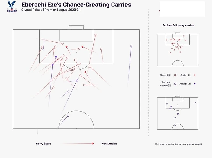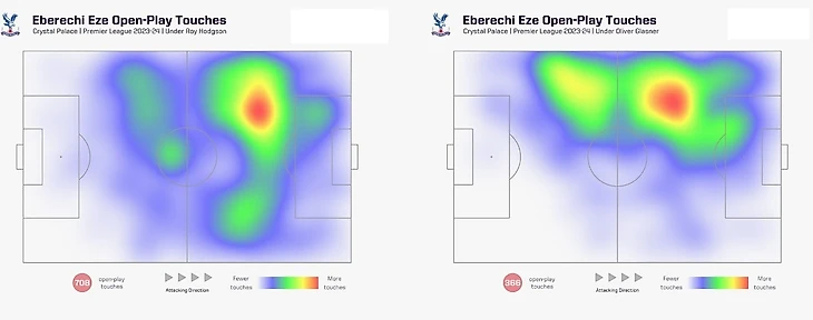Эффективность использования дриблинга Ззе в текущем сезоне свидетельствует об изменении в подходе. В предыдущие три сезона в Премьер-лиге он в среднем выполнял 3,9 дриблинга за 90 минут, но в этом сезоне его показатель вырос до 5,9. Несмотря на то, что его успешность в дриблинге снизилась с 62% в прошлом сезоне до 50% в текущем, увеличенное количество попыток говорит о том, что он уже превзошел свой общий показатель по дриблингу за прошлый сезон. Кроме того, неудачные попытки Ззе иногда создавали пространства для других игроков, что могло нанести вред соперникам «Пэлас». Общее улучшение выступлений «Пэлас» можно объяснить влиянием Гласнера. Эзе был одним из игроков, которые процветали под его руководством. Хотя Эзе в основном играл слева в течение всего сезона, с приходом Гласнера он стал чаще выходить на поле. Это обеспечивает большую ширину поля и позволяет Эзе оставаться в зоне, где он создает опасность, не так часто, как раньше. Тепловые карты также подтверждают этот подход.