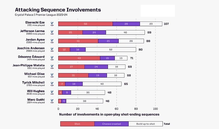 В центре внимания обоих этих выступлений стоит Эберечий Эзе. Этот 25-летний футболист играл ключевую роль во многих аспектах игры «Кристал Пэлас» в последние годы. Особенно ярко его выступление проявилось после победного гола на «Энфилде» в матче против «Ливерпуля». А в воскресенье в поединке с «Вест Хэмом» Дэвида Мойеса. Эзе продемонстрировал, возможно, свое лучшее выступление на сегодняшний день. Он реагировал на отраженные удары Жан-Филиппа Маттеты в воздухе, решив, что нужен экстравагантный велосипедный удар. И это оказалось справедливо, так как мяч влетел в сетку ворот. В общем, Эберечи Эзе продемонстрировал впечатляющие навыки в последних матчах. Он сделал семь бросков и четыре прострела, что на три больше, чем у любого другого игрока в команде. Кроме того, он успешно реализовал четыре из семи дриблингов и достиг 84,2% точности в передачах в последней трети поля.