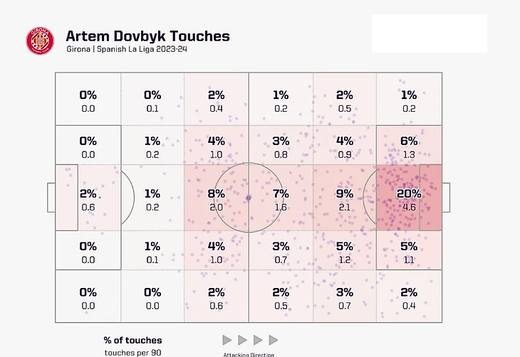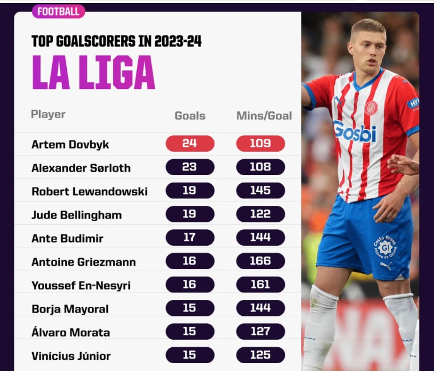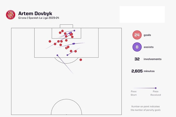 Украинец стал настоящим испытанием для защитников соперника, стремясь атаковать каждую подачу в штрафную. Это позволило ему забить множество голов. Он вошел в топ-10 Ла Лиги по количеству ударов (85) и попаданий в створ (46). Только Харри Кейн (30,6) и Эрлинг Хооланд (29,3) набрали больше очков xG, чем Довбик (24,3) в топ-5 европейских лиг.