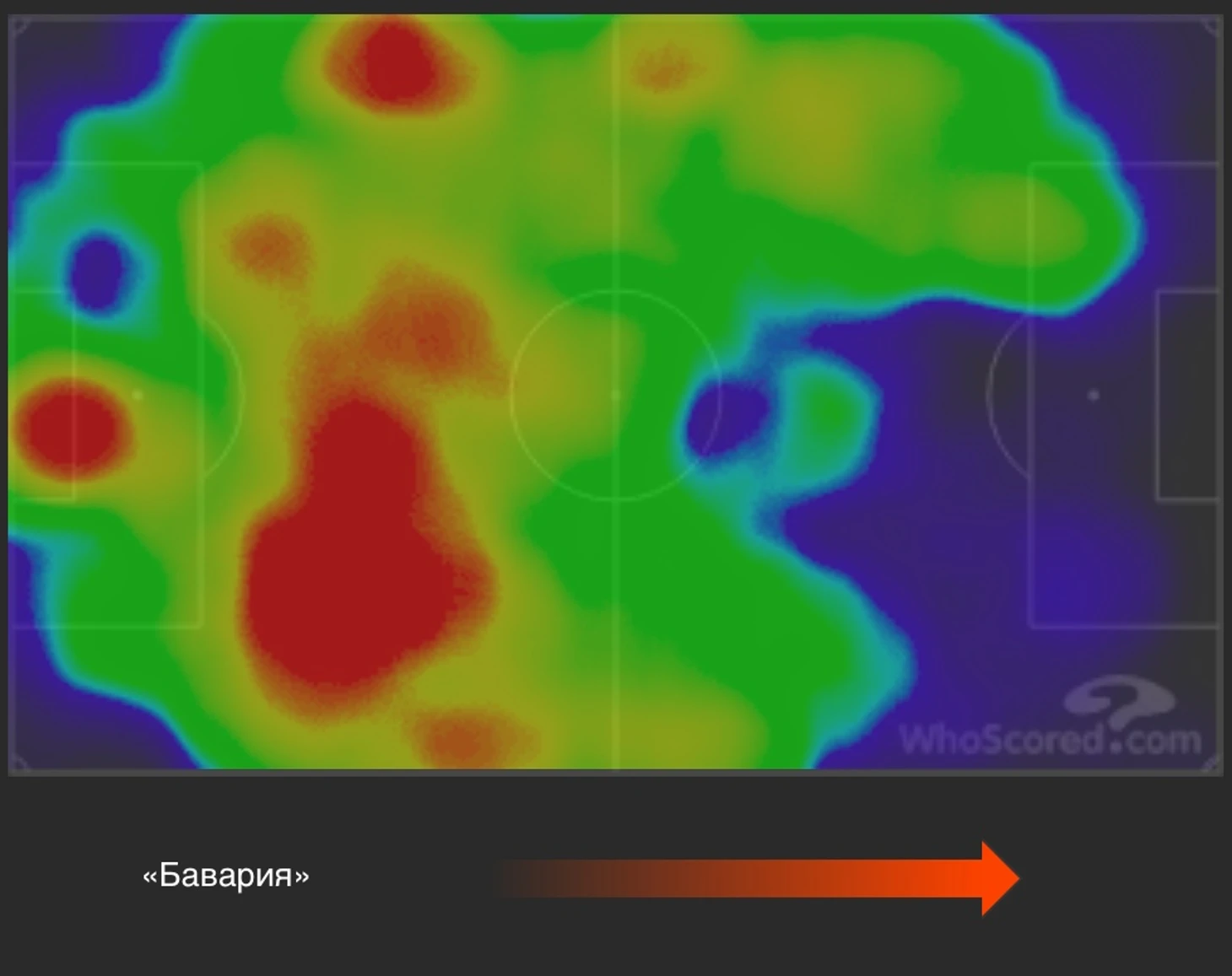 На рисунке отчетлива видна активность «мюнхенцев» в зоне Рафиньи и Зюле. Именно это и задумывал Клопп. Юрген вынудил «Баварию» играть через этих двух защитников, которые плохо продвигают мяч к центру поля. Они были под давлением постоянно. Гнабри крайне мало атаковал – это видно по очень малой активности на правом фланге атаки, но пас на гол отдал, именно он, а также создал самый опасный момент «Баварии» во втором тайме. Небольшой кусочек тепла в штрафной соперника – это Рибери, постоянно пытался лезть в штрафную площадь, но как только он там оказывался, то перед ним выростало несколько игроков «Ливерпуля».