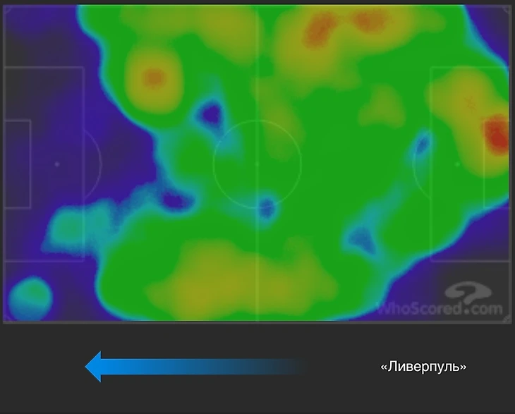 Желтое пятнышко слева в нападении – это прессинг Садио Мане и Эндрю Робертсона, а также их активность в атаке. Эта зона покрыта равномерным теплом, что указывает на план Клоппа. Маленький красненький кружок – это точка, где Салах получал мяч, но мы четко видим, что продожения, в виде входа в штрафную, не было.