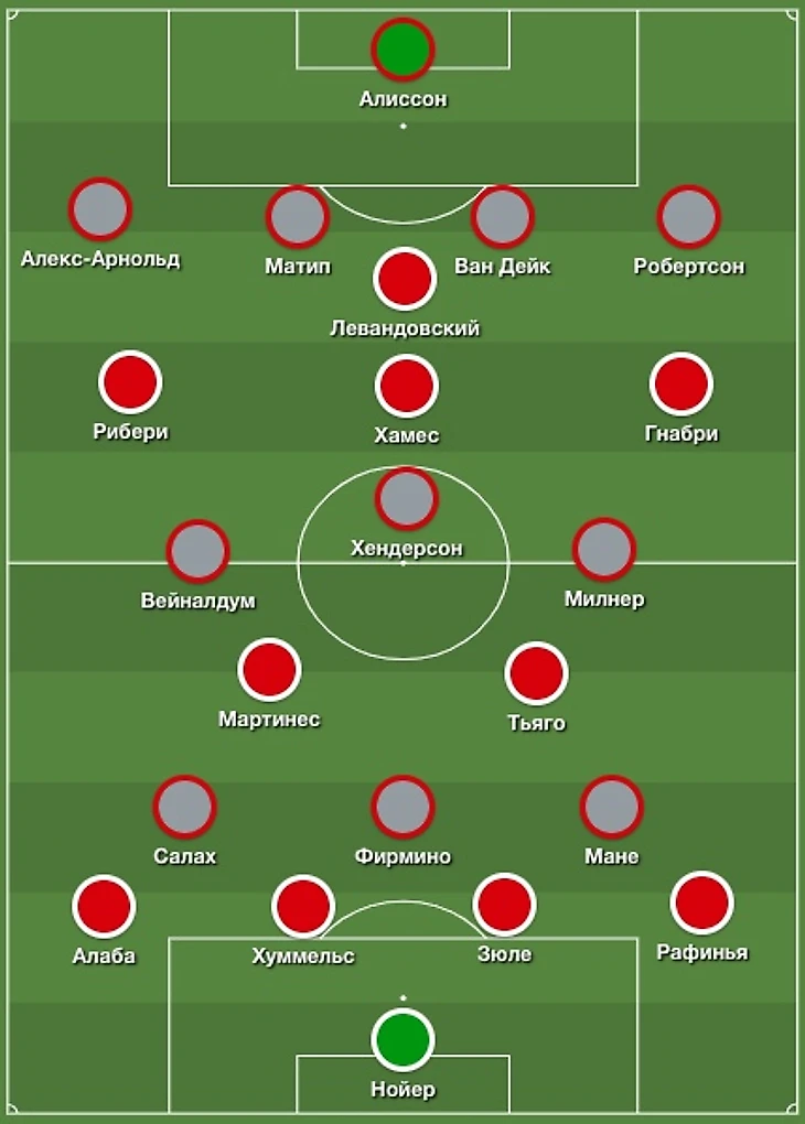 1. Юрген Клопп и его команда подошли к этому матчу без потери игроков основного состава. Именно эти 11 игроков втаскивали «Ливерпуль» в финал Лиги чемпионов в прошлом сезоне. Немецкий специалист выбирает самый сыгранный вариант состава. Обычно у Клоппа меняются функции центральных защитников. В матчах с командами, которые уступают в классе «красным» Вирджил Ван Дейк играет выдвинутого защитника, а второй центрбек – страхующего. В этой игре Жоэль Матип был выше и иногда выбрасывался в центр поля для помощи опорному полузащитнику, а Ван Дейк был последним, чтобы успевать выигрывать позицию у атакующих игроков «Баварии».