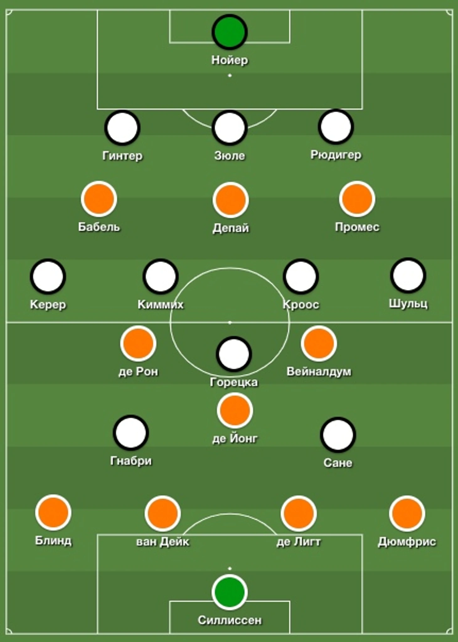 Немцы предоставили полную свободу Френки де Йонгу, который не имел прямого оппонента. Горецка уходил в нападение, а с Киммихом и Тони Кроосом играли Джорджиньо Вейналдум и де Рон. Лев сознатльно отдал центр поля и играл через левый фланг. Де Йонг терялся, постоянно оказываясь без оппонента. Френки находился в позиции, где было много свободы. До Горецки добегать не нужно, а Киммих и Кроос были гораздо глубже. Связующим звеном был Шульц. Германия часто выходила в атаку именно через его фланг, а центр поля немцы не использовали совсем. Из таких ситуаций пришли два гола немцев в первом тайме и еще несколько очень опасных моментов.