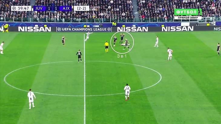 Игроки «Аякса» не дают принимать решение футболисту «Юве» и накрывают его в центре втроем.