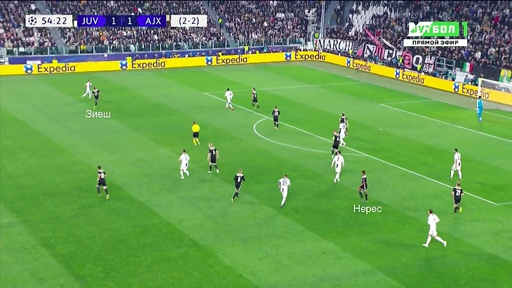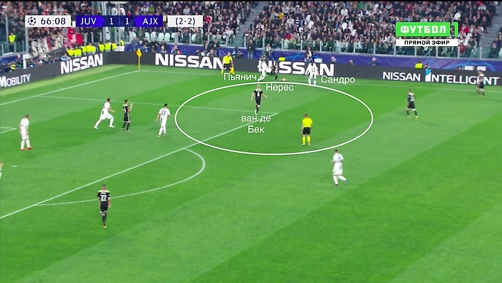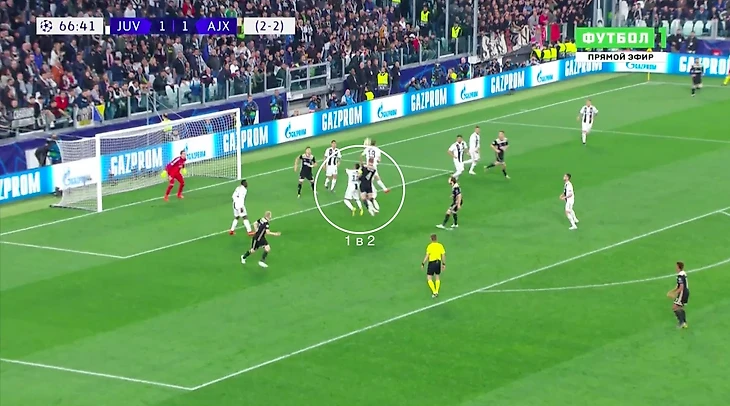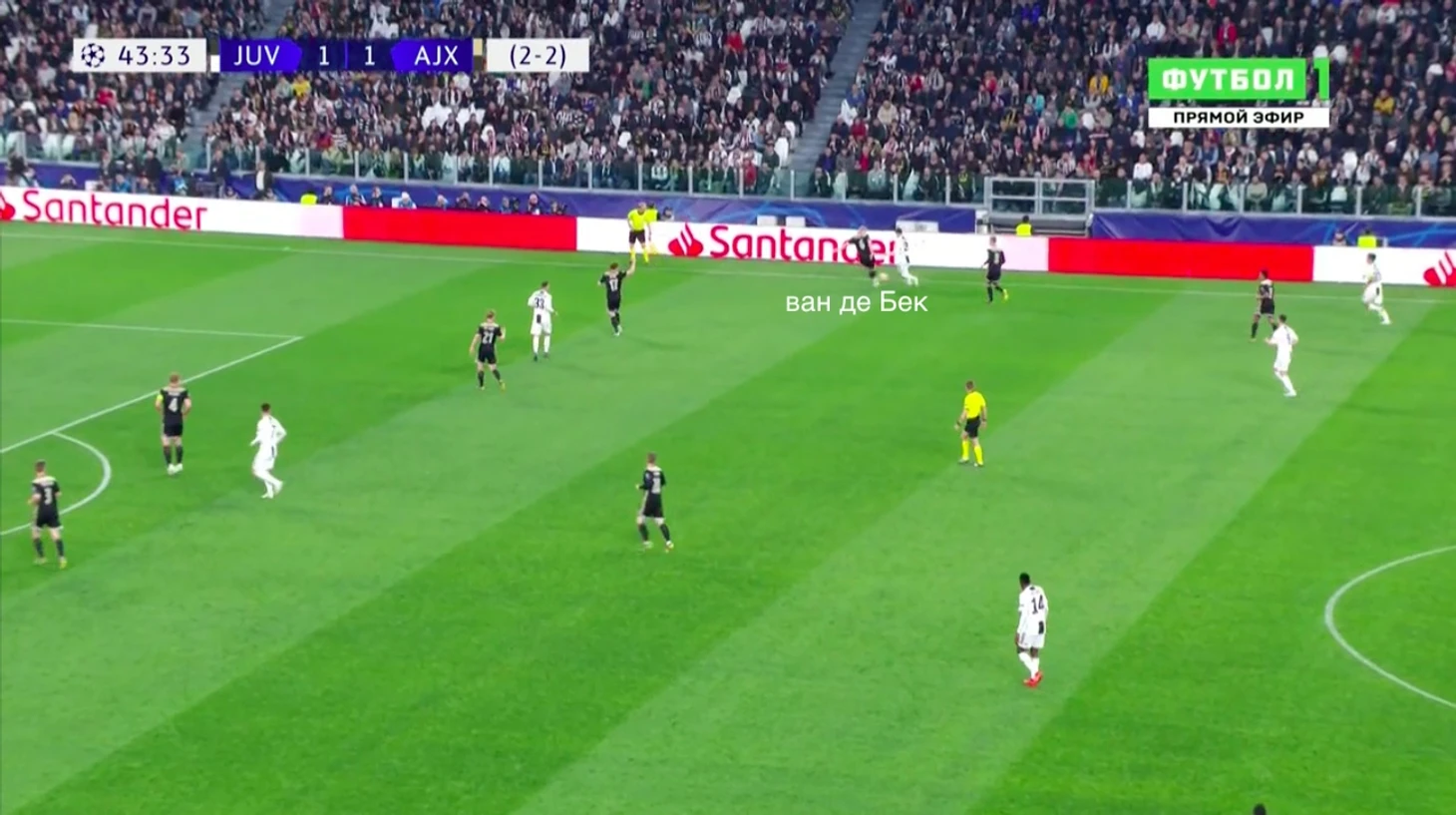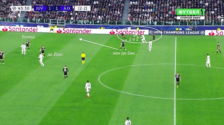 «Юве» выходит победителем из ситуации «два в два». Де Йонг оглядывается на прямого оппонента, а Блинд тоже опекает игрока. В такой момент на помощь приходит ван де Бек и страхует зону, чтобы минимизировать опасность атаки соперника
