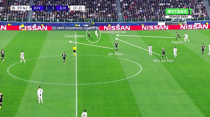 Бернардески плохо обрабатывает пас, а игроки «Аякса» тонко чувствуют такой момент и стремятся числом накрыть соперника. В этот момент де Йонг идет страховать спину партнера при возможном обыгрыше «один в один»