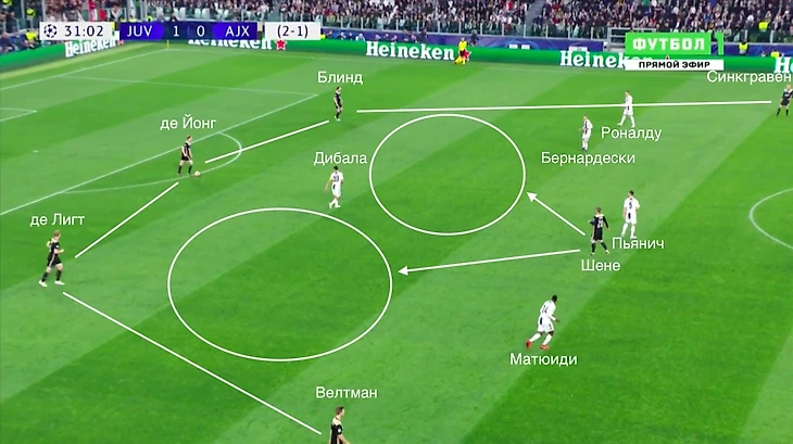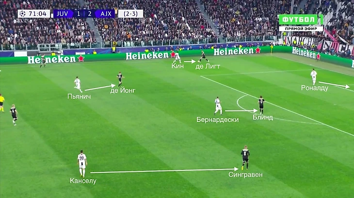 «Юве» вскрывает правый фланг. Блинд идет страховать левого защитника, а де Йонг тем временем займет позицию центрдефа