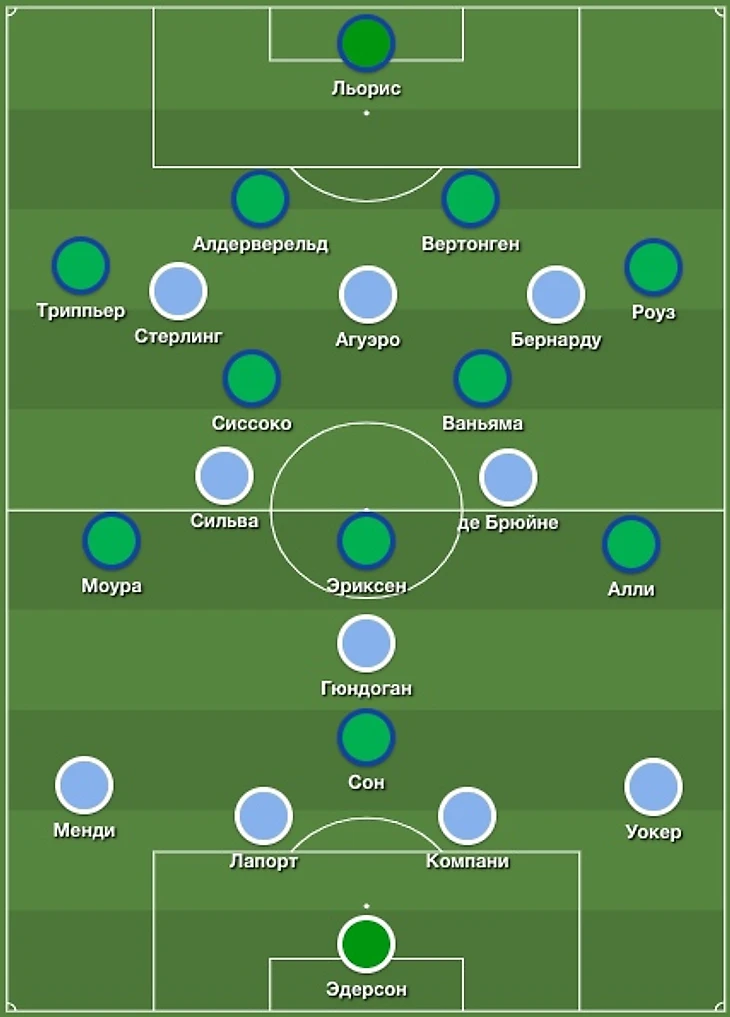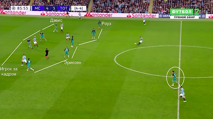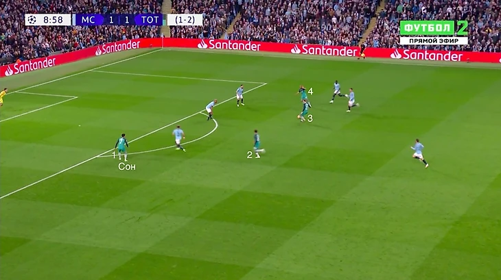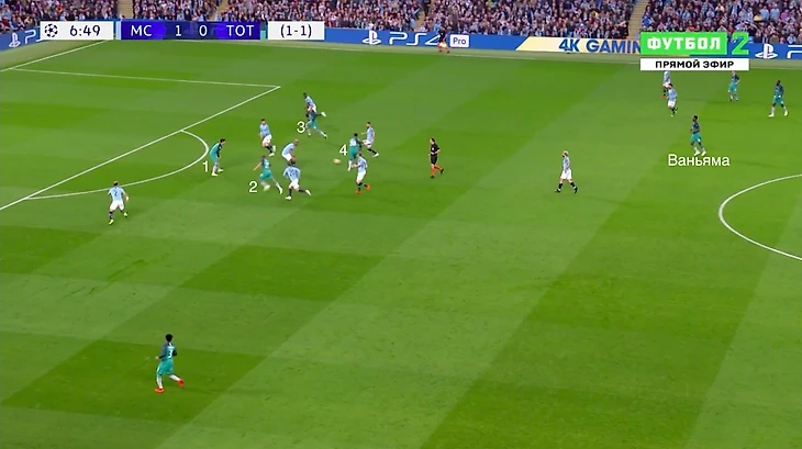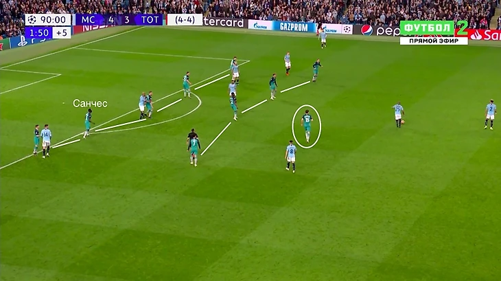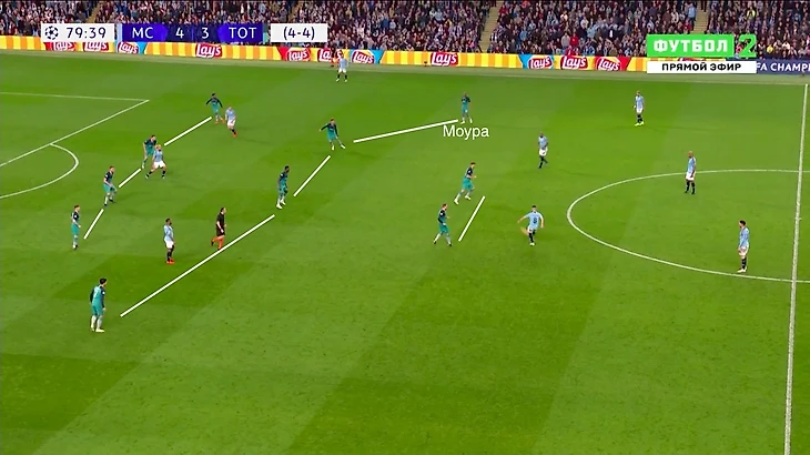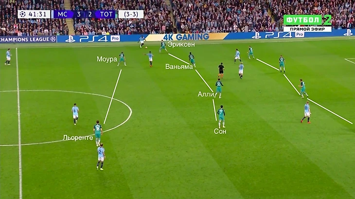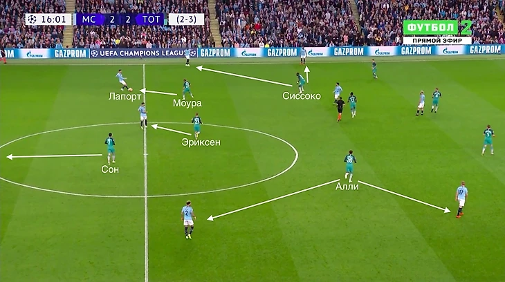 Такое построение позволяло «Тоттэнхэму» изолировать от мяча Кевина Де Брюйне и Давида Сильву в центре поля, но если «Сити» преодолевал этот прессинг, то эффективно атаковал через фланги.