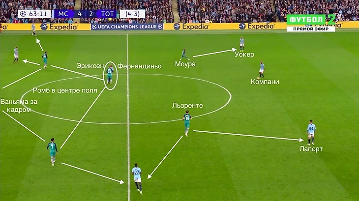 «Тоттенхэм» снова переходит на ромб, так как теперь ему необходим гол. Гвардиола выпустил Фернандиньо вместо Сильвы. Бразилец занял привычную позицию в опороной зоне. Ситуация выглядела так: