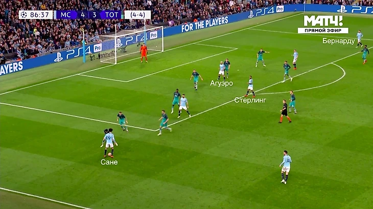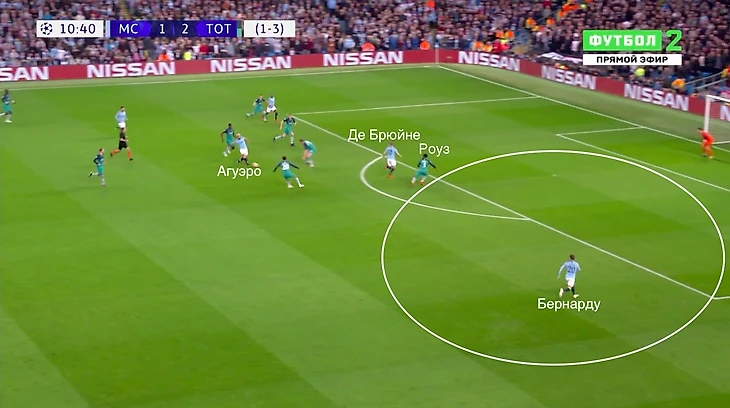 Серхио Агуэро с мячом, Бернарду Силва свободен. Три игрока «Тоттенхэма» позволяют сделать передачу на Бернарду. Португалец свободно войдет в штрафную и решит момент